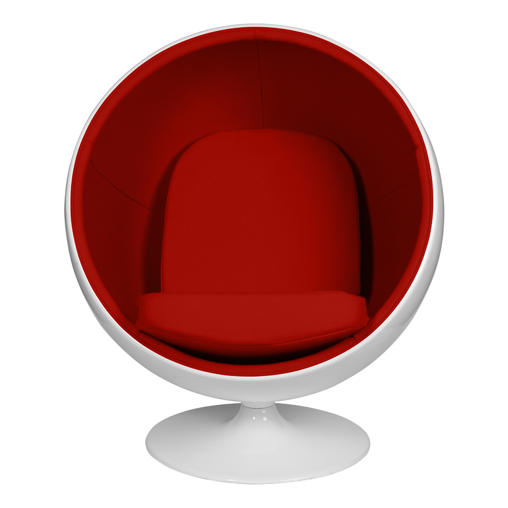 Каркас изготовлен из стеклопластика. Звукоизоляция обеспечивается использованием пенообразного наполнителя. Возможность вращения по всей оси достигается благодаря прочной металлической ножке с вращающимся основанием. Обивка выполнена из контрастирующих с основным белым цветом красных шерстяных подушек. Современные модели предусматривают возможность встраивания в кресло Ball chair телефона и аудио-колонок. Кресло Eero Aarnio краснаое.